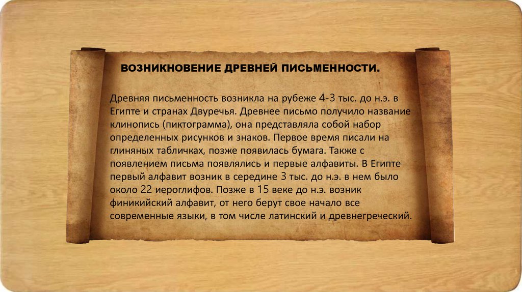 ВОЗНИКНОВЕНИЕ ДРЕВНЕЙ ПИСЬМЕННОСТИ.Древняя письменность возникла на рубеже 4-3 тыс. до н.э. в