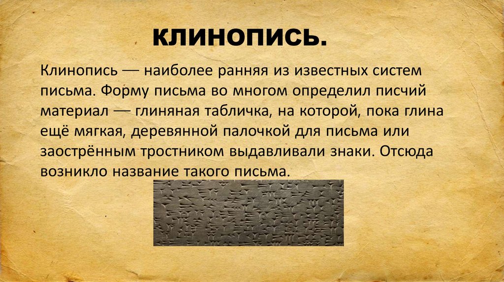 КЛИНОПИСЬ.Клинопись — наиболее ранняя из известных систем