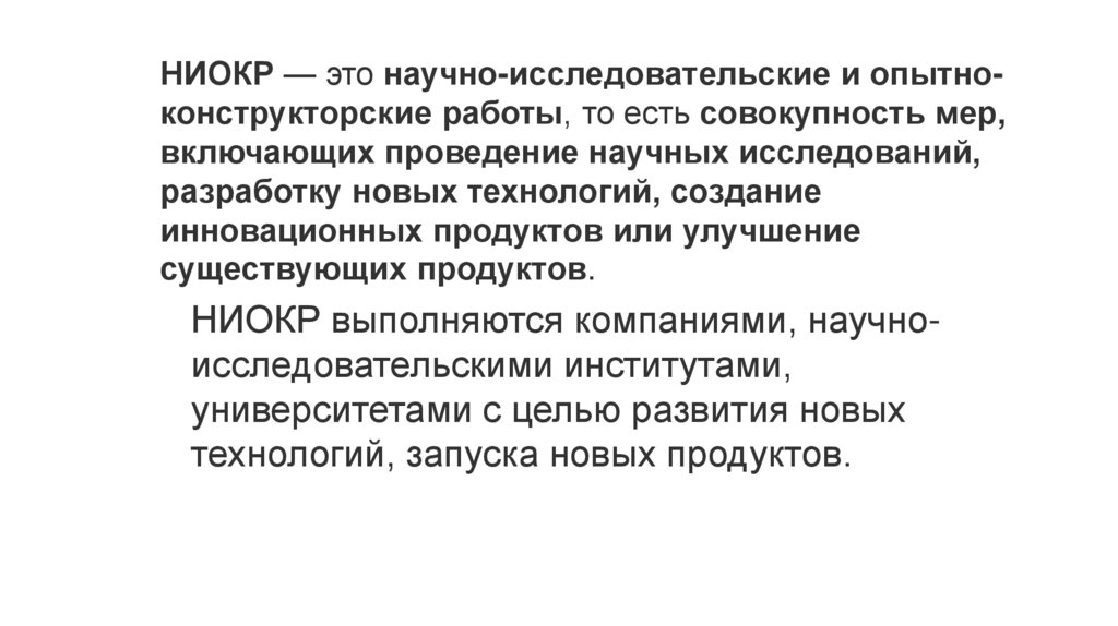 НИОКР — это научно-исследовательские и опытноконструкторские работы, то есть совокупность мер,включающих проведение научных исследований,