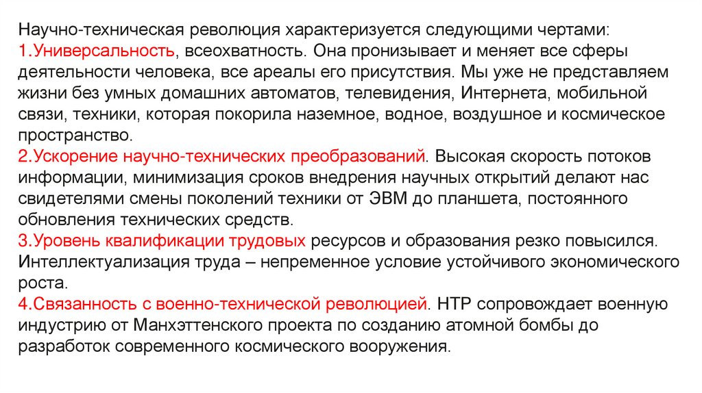 Научно-техническая революция характеризуется следующими чертами:1.Универсальность, всеохватность. Она пронизывает и меняет все сферы