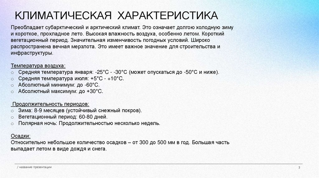 o Зима: 8-9 месяцев (устойчивый снежный покров).