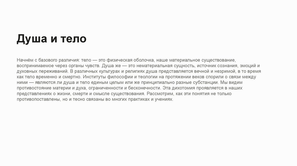 Душа и телоНачнём с базового различия: тело — это физическая оболочка, наше материальное существование,