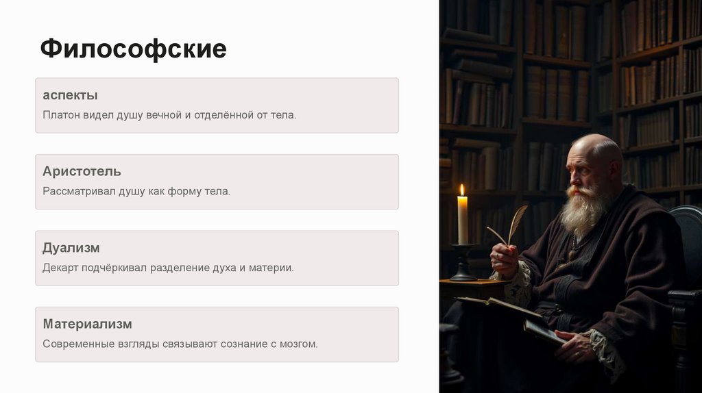 воспринимаемое через органы чувств. Душа же — это нематериальная сущность, источник сознания, эмоций и