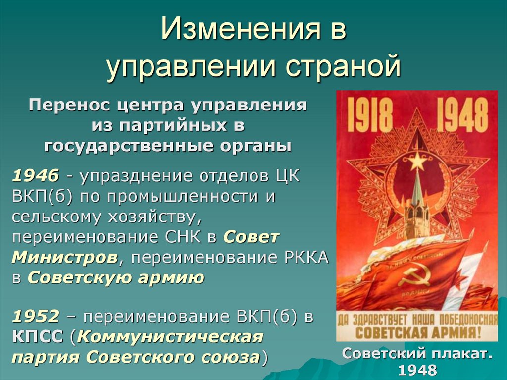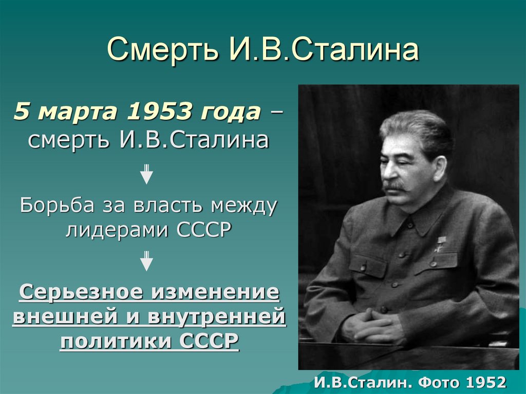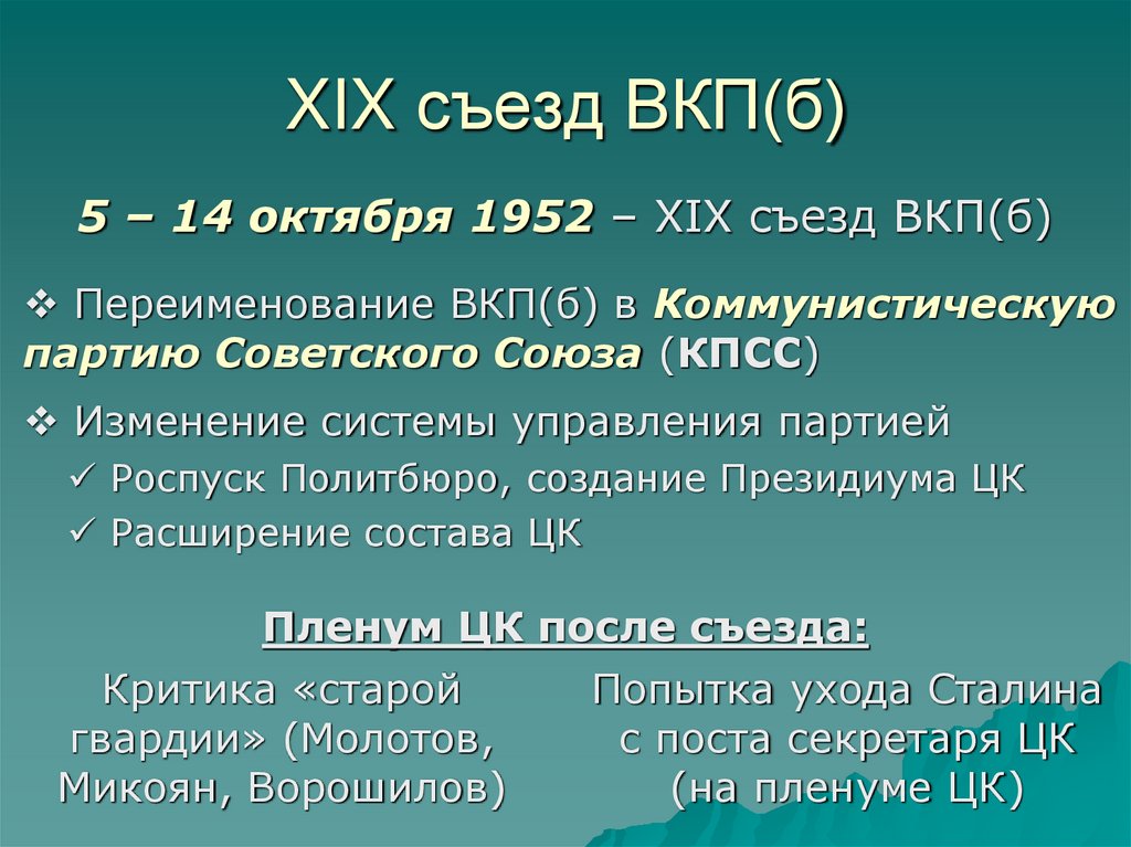 5 – 14 октября 1952 – XIX съезд ВКП(б)Переименование ВКП(б) в Коммунистическую