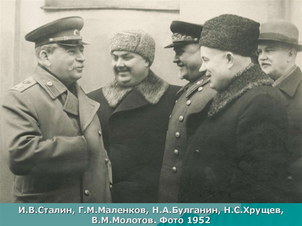 И.В.Сталин, Г.М.Маленков, Н.А.Булганин, Н.С.Хрущев,В.М.Молотов. Фото 1952