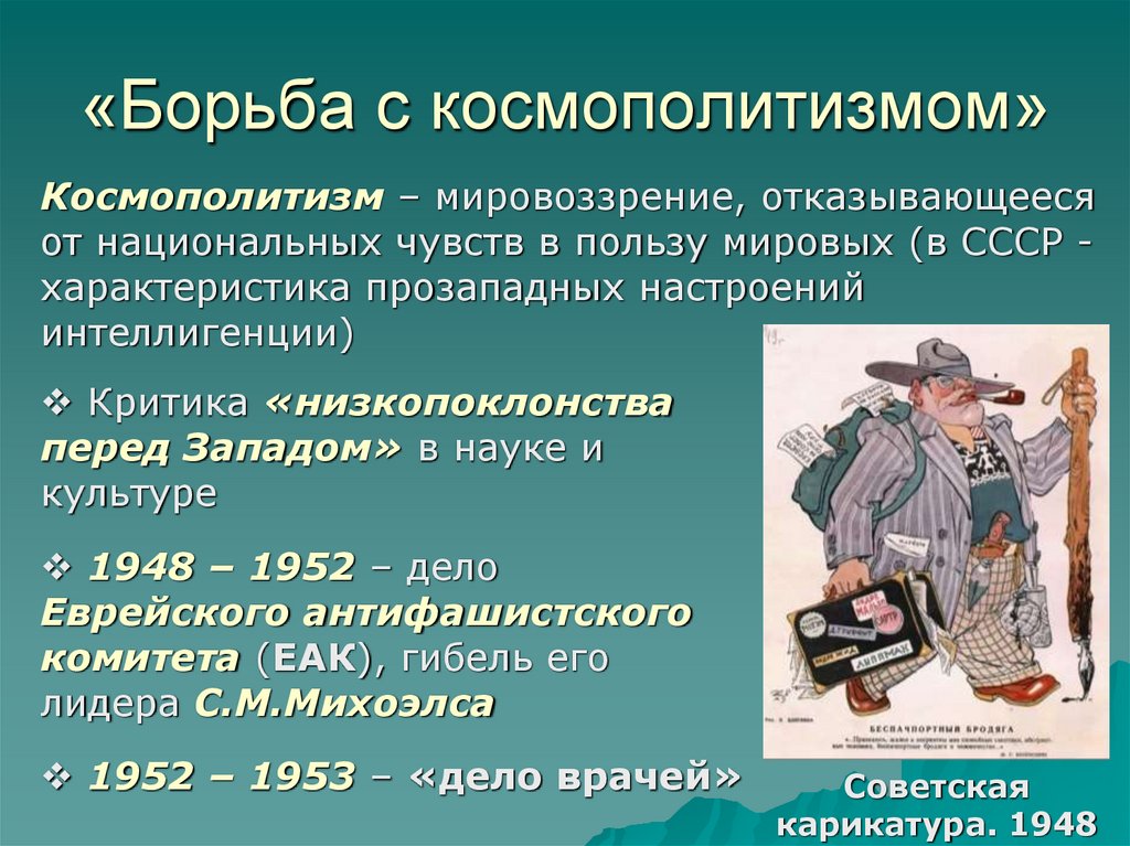 Космополитизм – мировоззрение, отказывающеесяот национальных чувств в пользу мировых (в СССР характеристика прозападных настроений