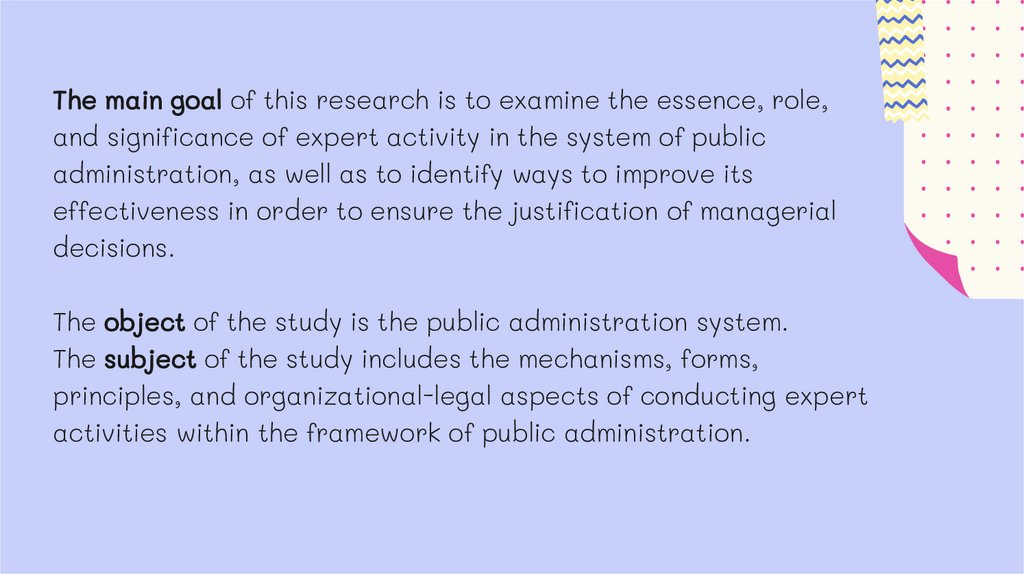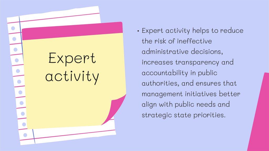 The main goal of this research is to examine the essence, role,and significance of expert activity in the system of public