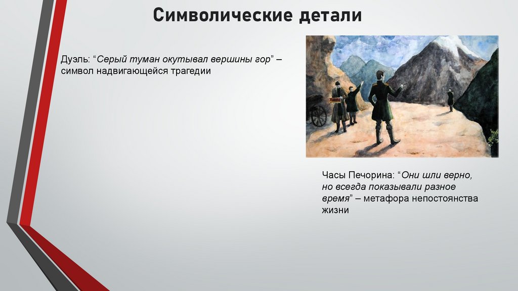 Символические деталиДуэль: “Серый туман окутывал вершины гор” –