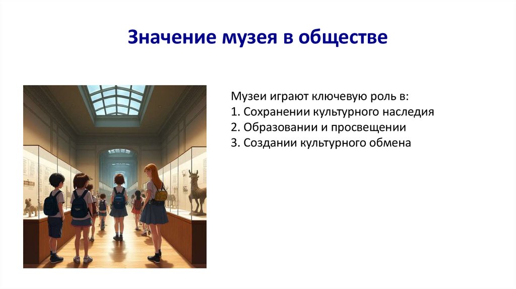 Значение музея в обществеМузеи играют ключевую роль в: