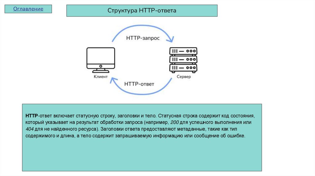 HTTP-ответ включает статусную строку, заголовки и тело. Статусная строка содержит код состояния,