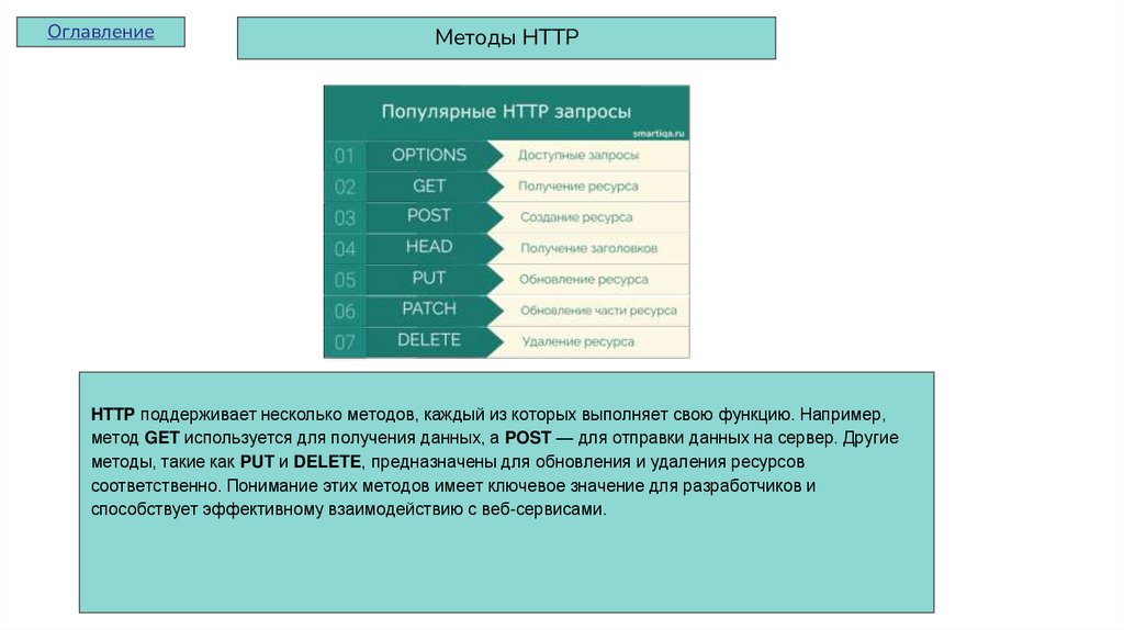 HTTP поддерживает несколько методов, каждый из которых выполняет свою функцию. Например,