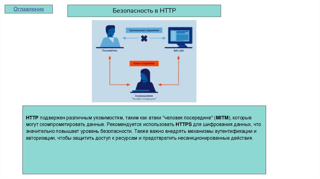 HTTP подвержен различным уязвимостям, таким как атаки "человек посередине" (MITM), которые