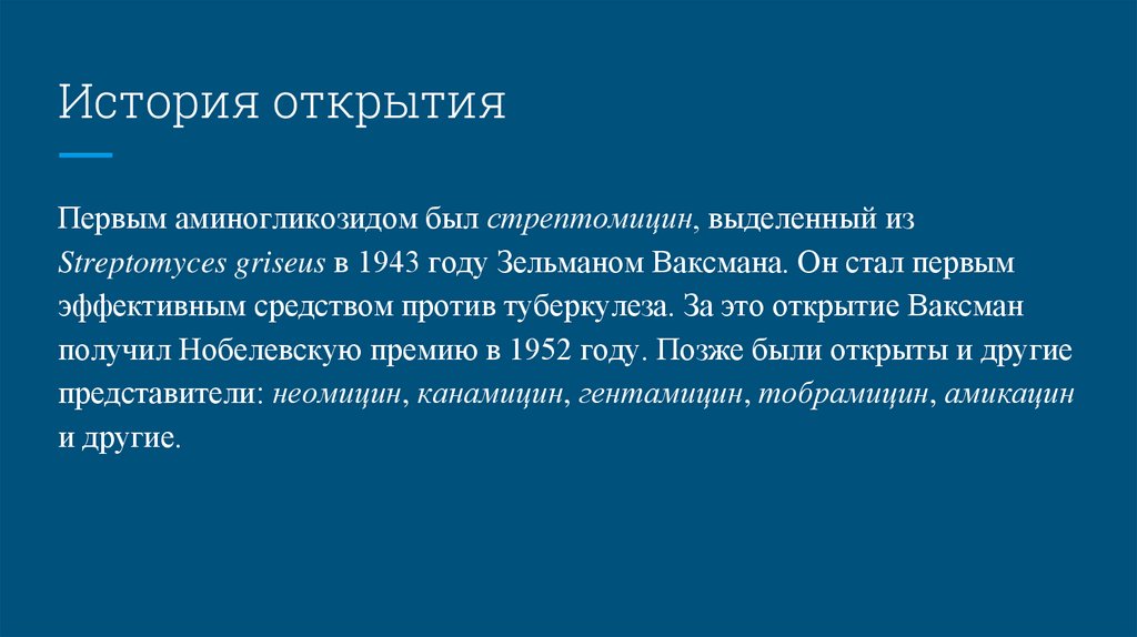 История открытияПервым аминогликозидом был стрептомицин, выделенный из