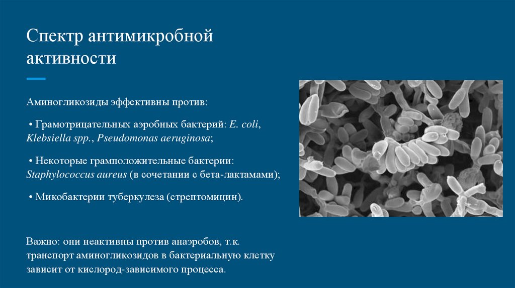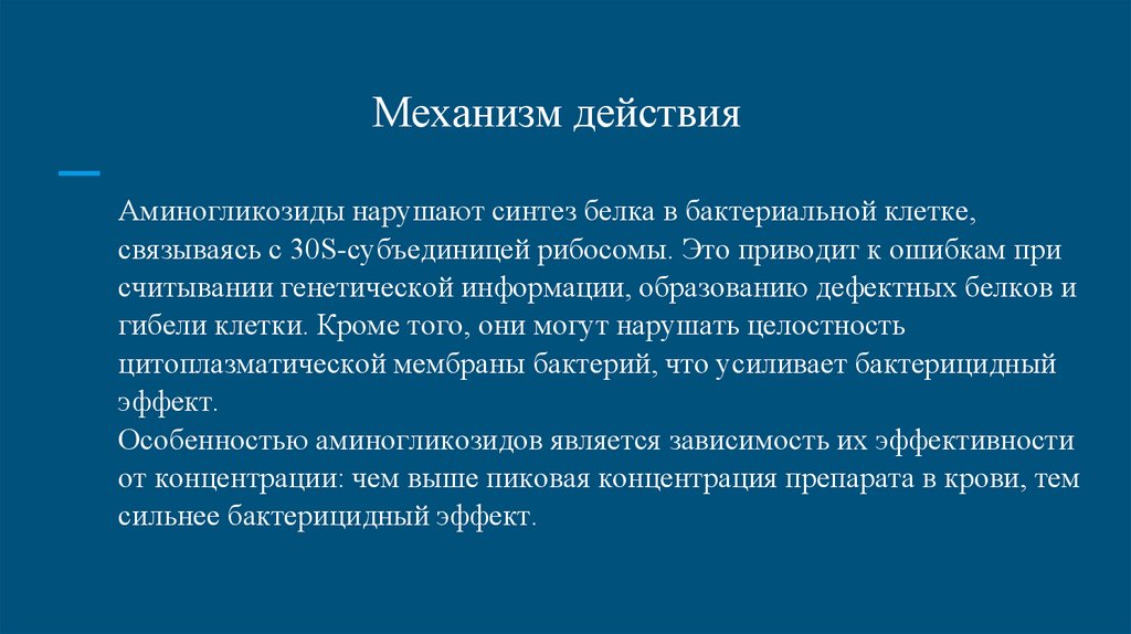 Механизм действияАминогликозиды нарушают синтез белка в бактериальной клетке,