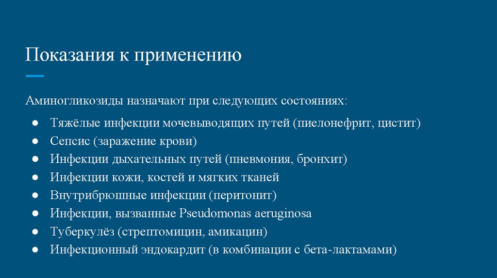 Показания к применениюАминогликозиды назначают при следующих состояниях: