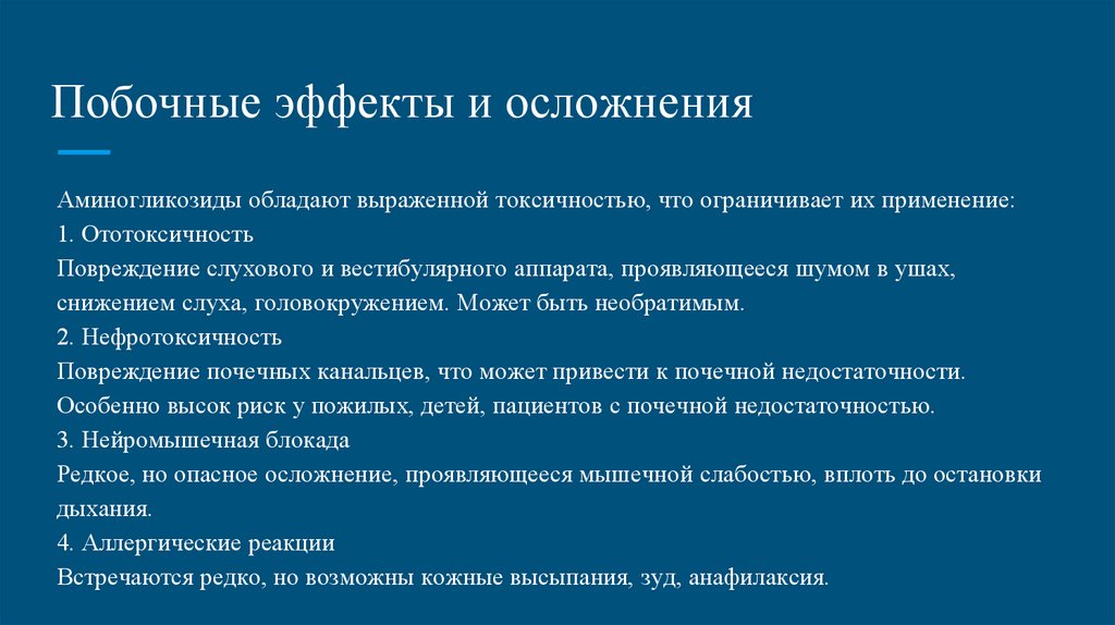 Побочные эффекты и осложненияАминогликозиды обладают выраженной токсичностью, что ограничивает их применение: