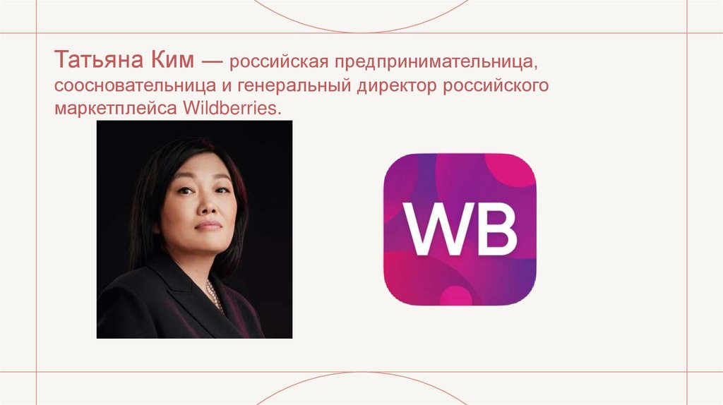 13. Татьяна Ким — российская предпринимательница, соосновательница и генеральный директор российского маркетплейса Wildberries.
