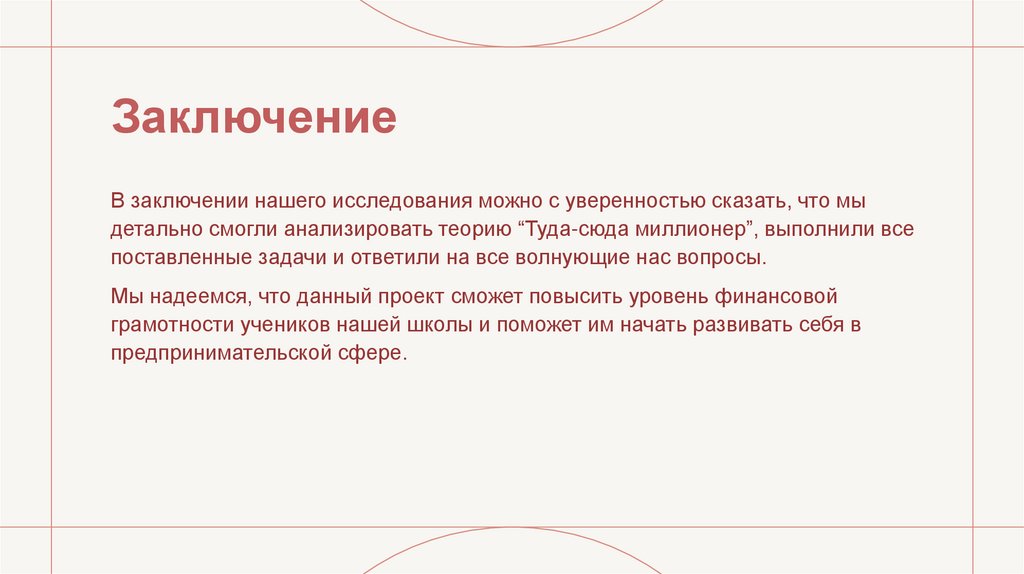 В заключении нашего исследования можно с уверенностью сказать, что мыдетально смогли анализировать теорию “Туда-сюда миллионер”, выполнили все