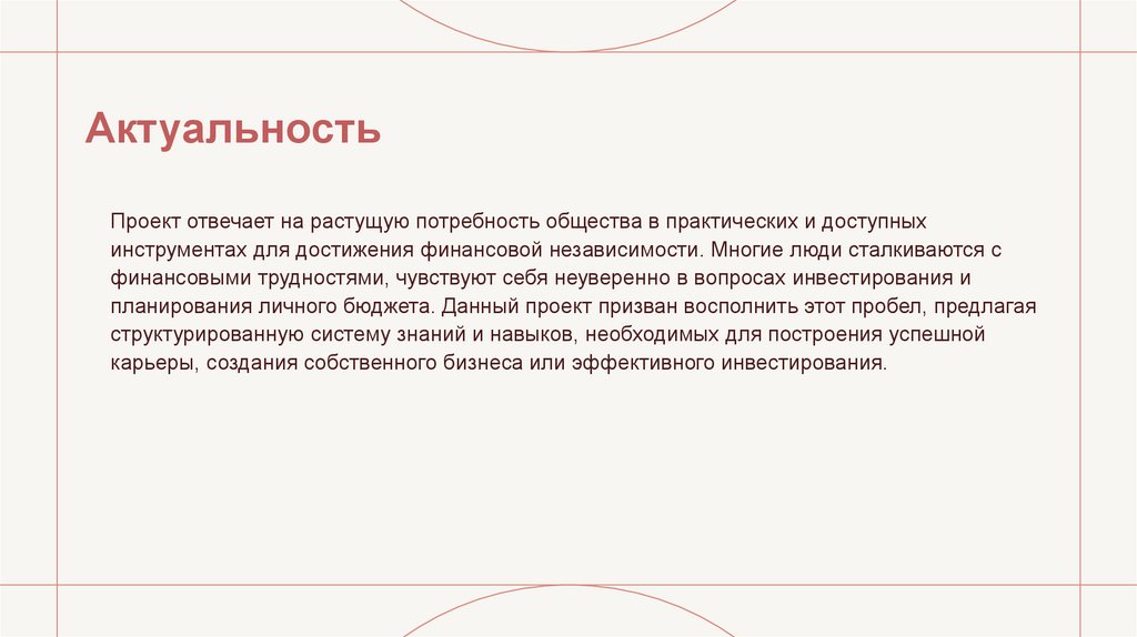 Проект отвечает на растущую потребность общества в практических и доступныхинструментах для достижения финансовой независимости. Многие люди сталкиваются с