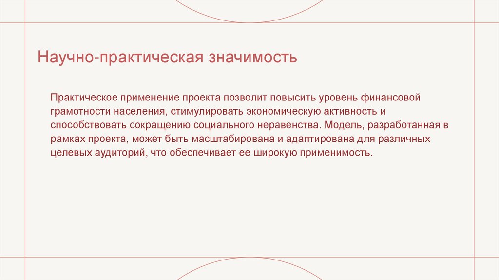 Практическое применение проекта позволит повысить уровень финансовойграмотности населения, стимулировать экономическую активность и