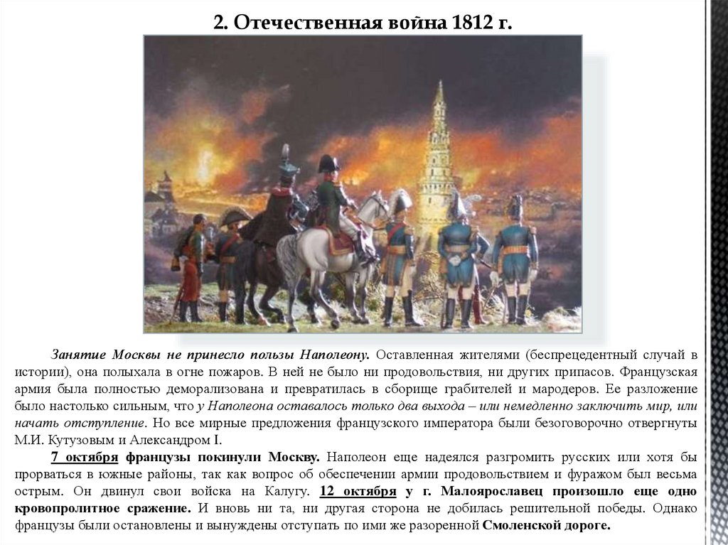 2. Отечественная война 1812 г.Занятие Москвы не принесло пользы Наполеону. Оставленная жителями (беспрецедентный случай в