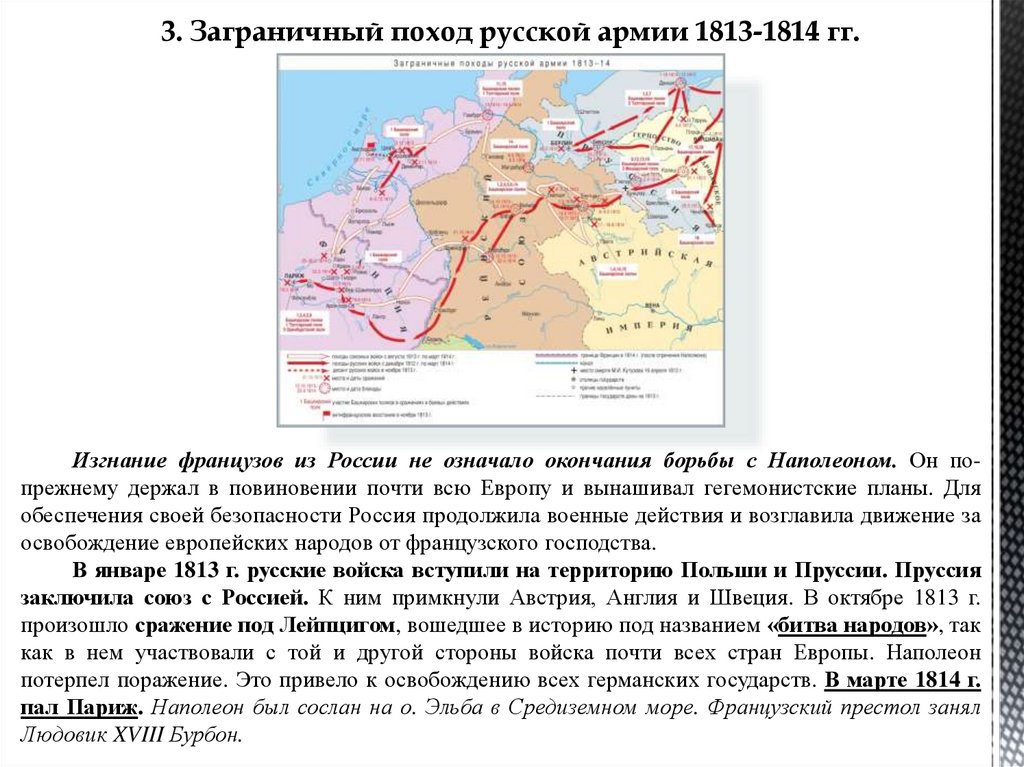 3. Заграничный поход русской армии 1813-1814 гг.Изгнание французов из России не означало окончания борьбы с Наполеоном. Он попрежнему держал в повиновении почти всю Европу и вынашивал гегемонистские планы. Для