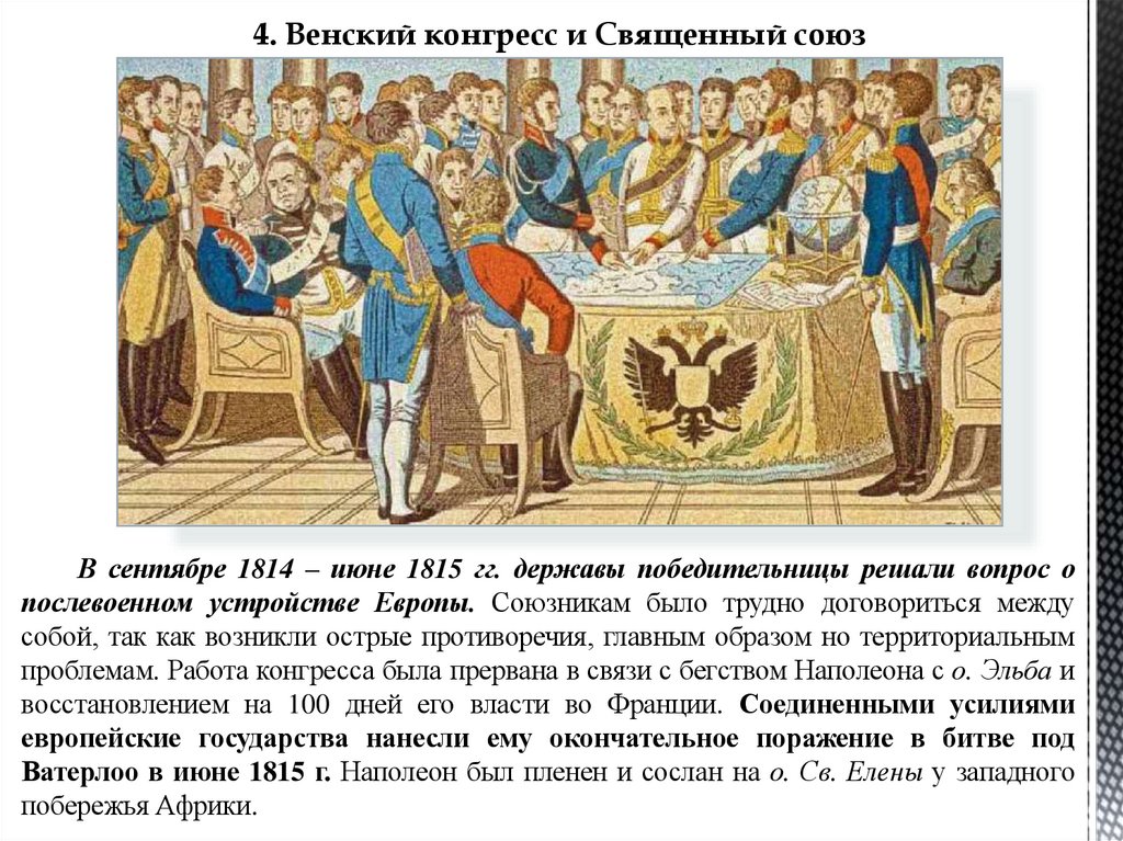 4. Венский конгресс и Священный союзВ сентябре 1814 – июне 1815 гг. державы победительницы решали вопрос о