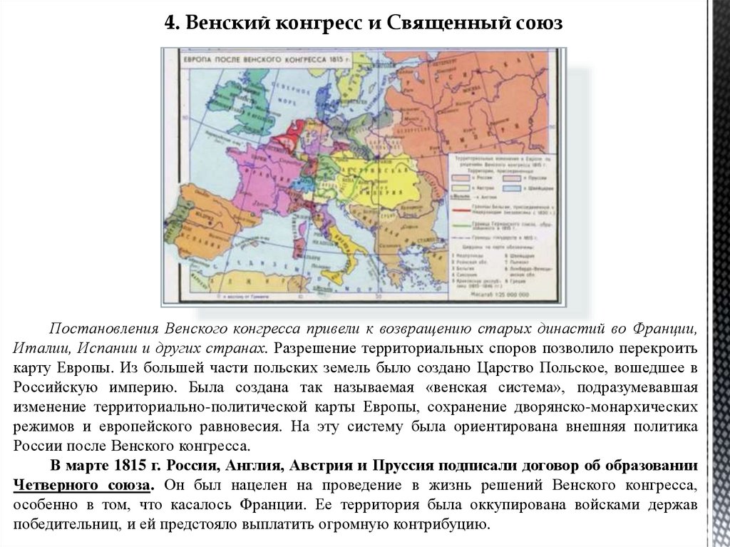 4. Венский конгресс и Священный союзПостановления Венского конгресса привели к возвращению старых династий во Франции,