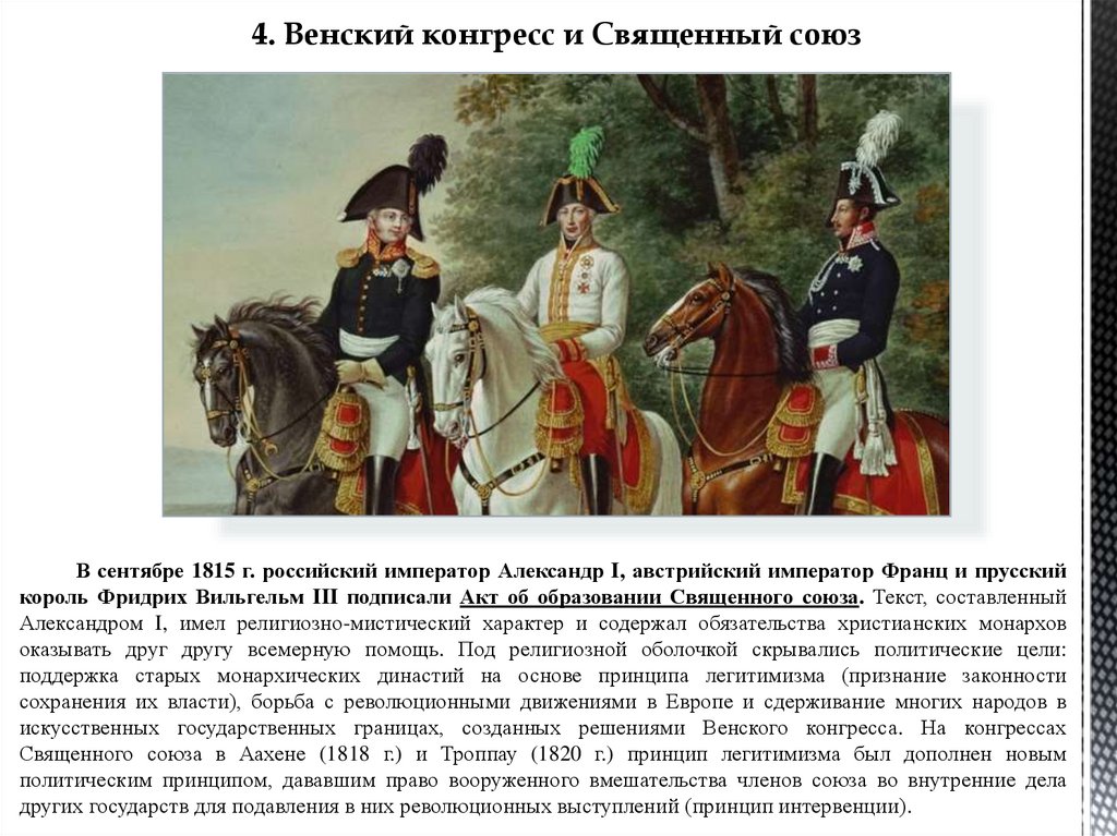 4. Венский конгресс и Священный союзВ сентябре 1815 г. российский император Александр I, австрийский император Франц и прусский