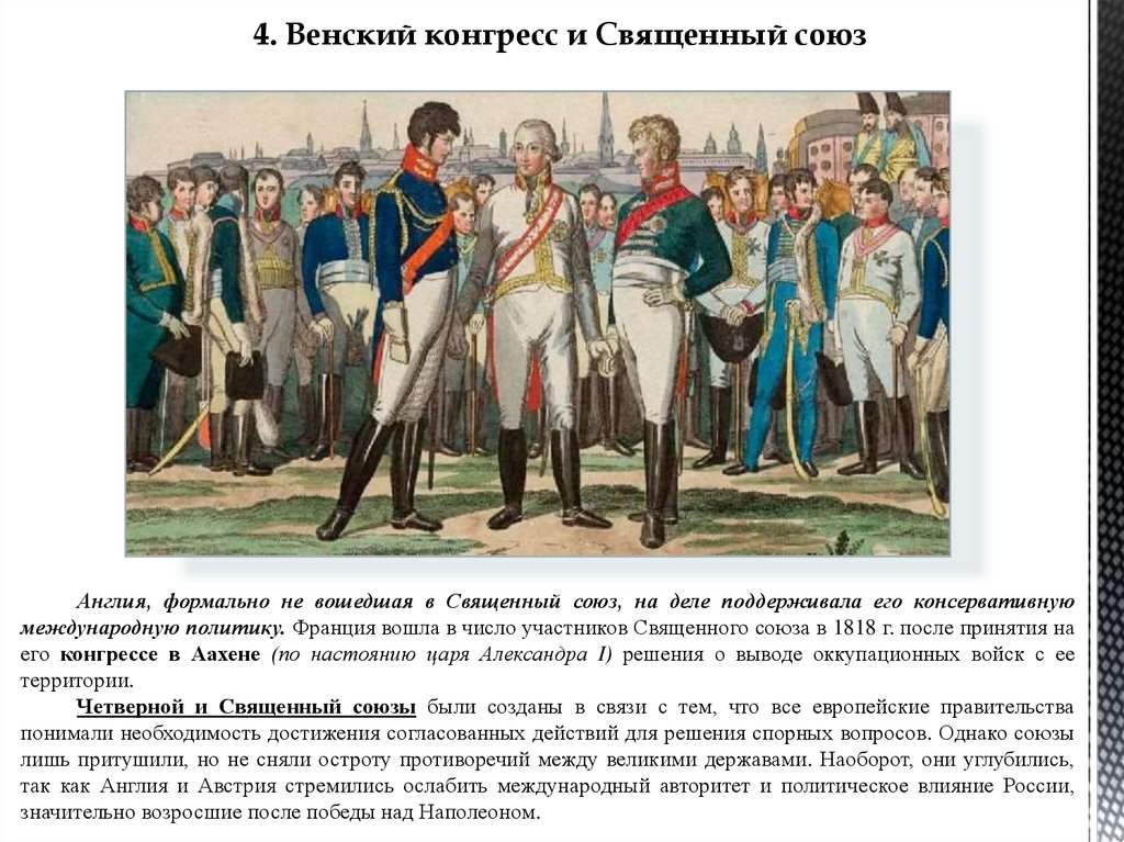 4. Венский конгресс и Священный союзАнглия, формально не вошедшая в Священный союз, на деле поддерживала его консервативную