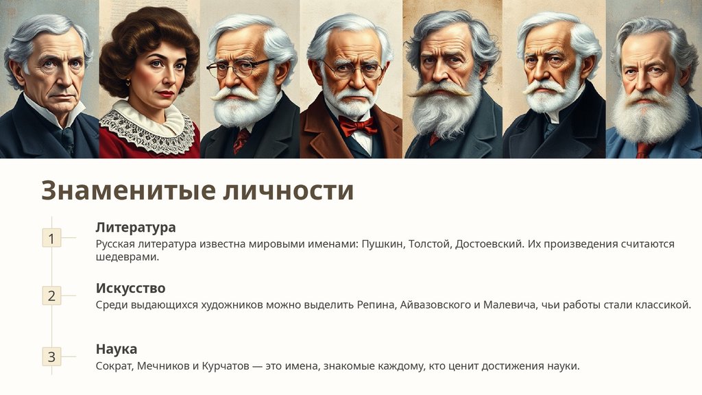 Среди выдающихся художников можно выделить Репина, Айвазовского и Малевича, чьи работы стали классикой.