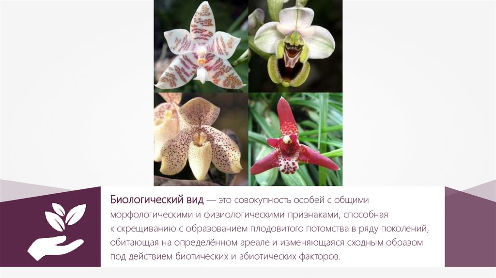 Биологический вид — это совокупность особей с общимиморфологическими и физиологическими признаками, способная