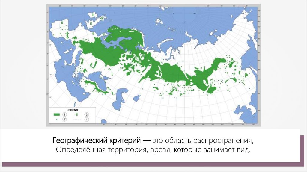 Географический критерий — это область распространения,Определённая территория, ареал, которые занимает вид.