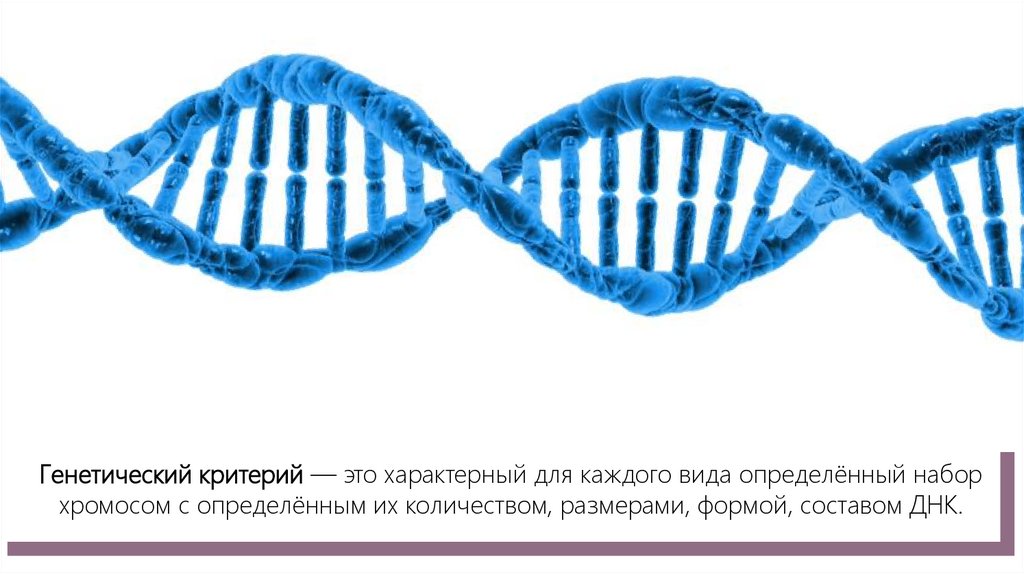 Генетический критерий — это характерный для каждого вида определённый наборхромосом с определённым их количеством, размерами, формой, составом ДНК.