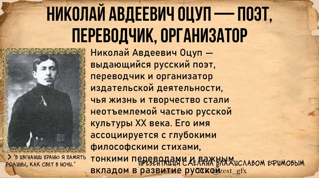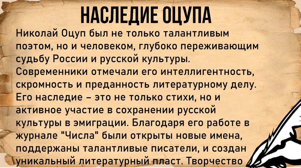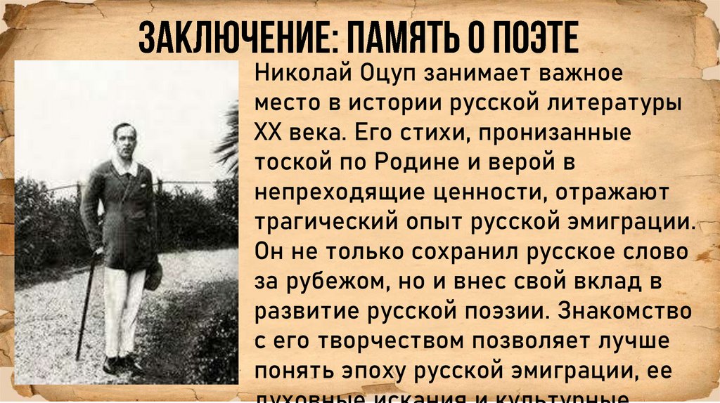 • - Николай Оцуп был талантливым поэтом, чье творчествоотличалось философской глубиной и тонкостью формы.
