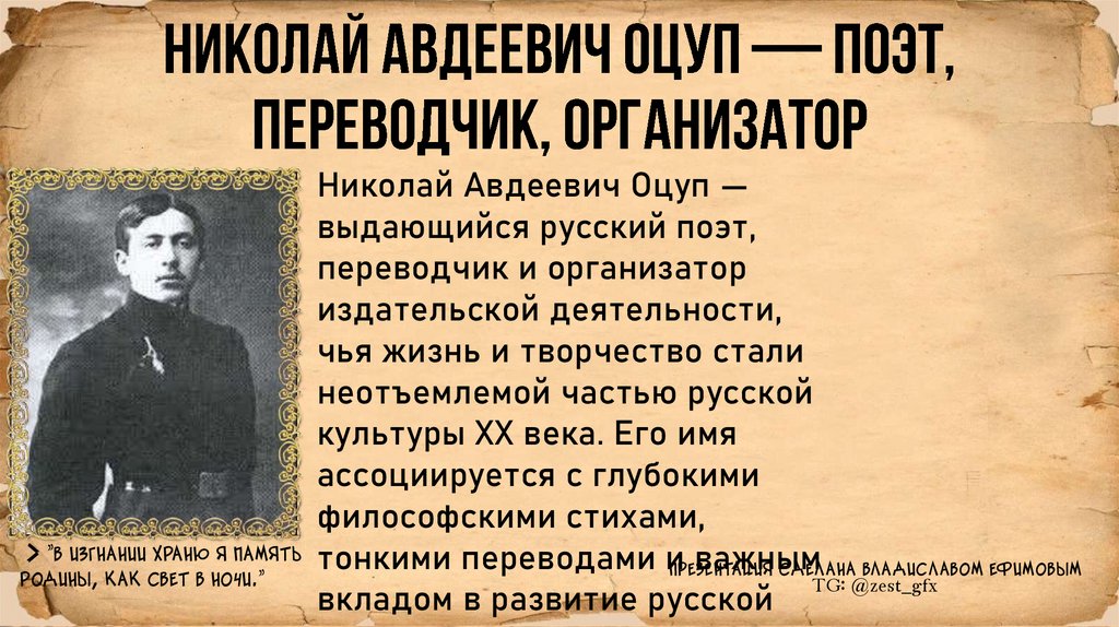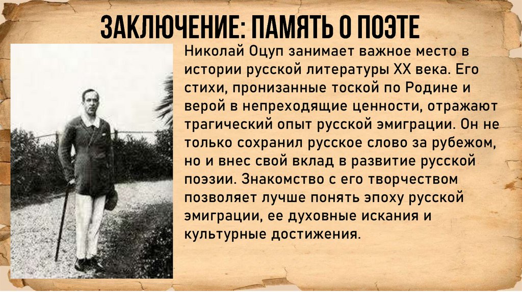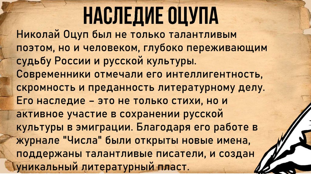 • - Николай Оцуп был талантливым поэтом, чье творчествоотличалось философской глубиной и тонкостью формы.