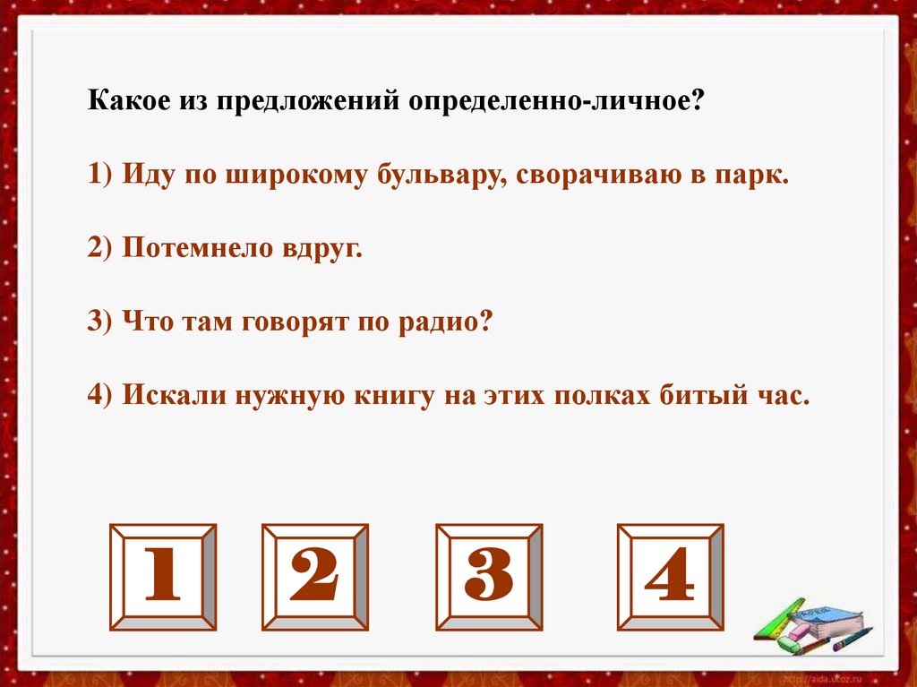Какое из предложений определенно-личное?1) Иду по широкому бульвару, сворачиваю в парк.