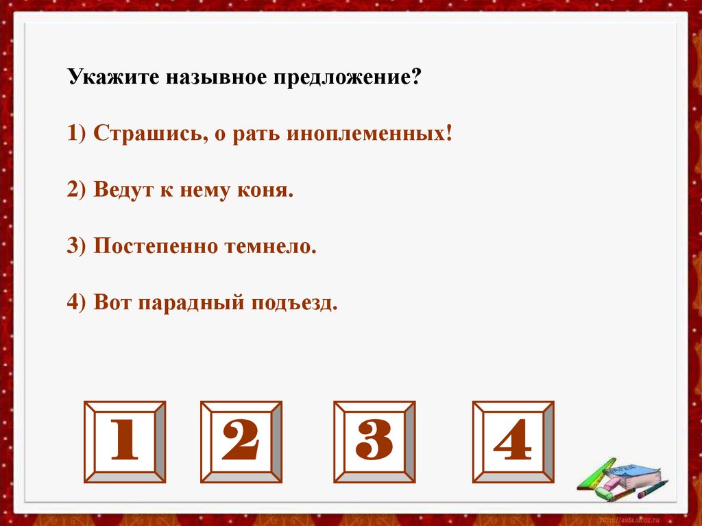 Укажите назывное предложение?1) Страшись, о рать иноплеменных!