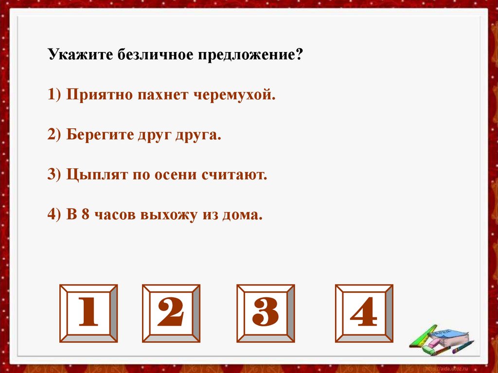 Укажите безличное предложение?1) Приятно пахнет черемухой.