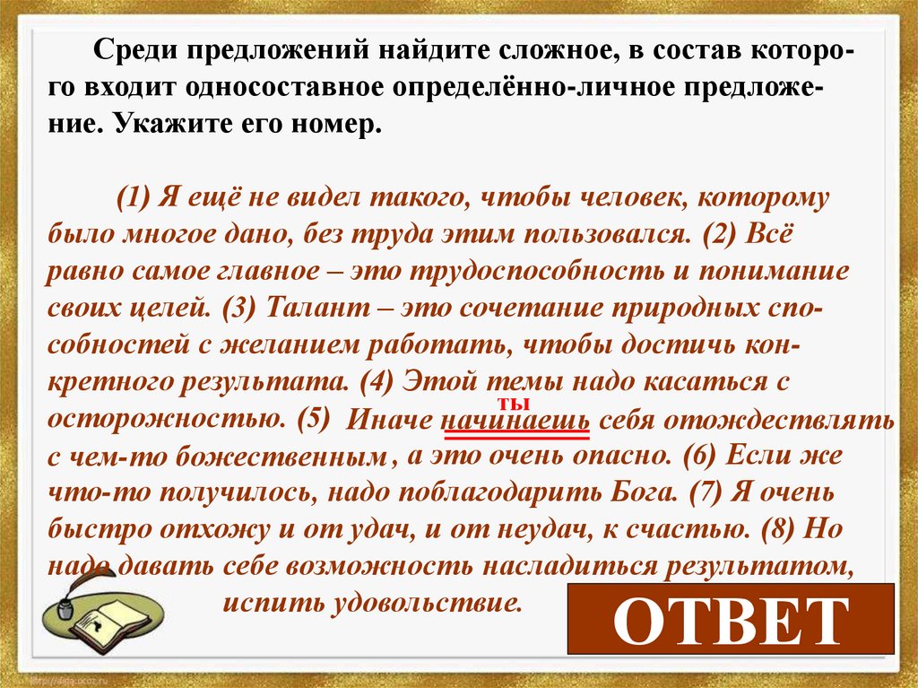 Среди предложений найдите сложное, в состав которого входит односоставное определённо-личное предложение. Укажите его номер.(1) Я ещё не видел такого, чтобы человек, которому
