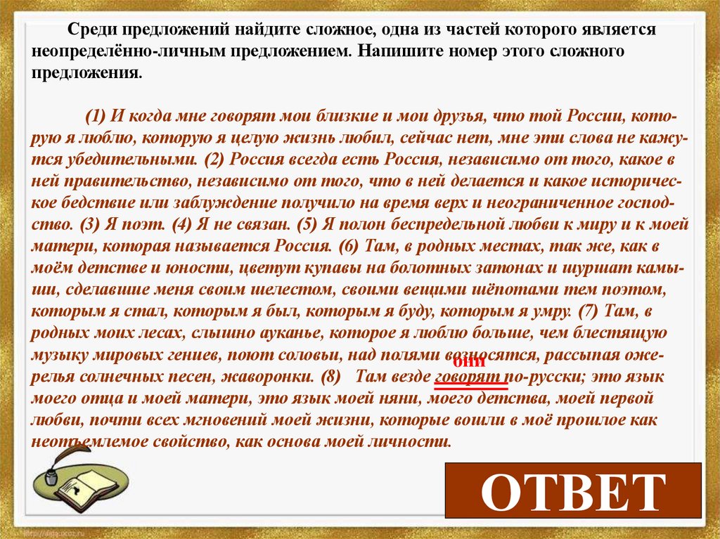 Среди предложений найдите сложное, одна из частей которого являетсянеопределённо-личным предложением. Напишите номер этого сложного