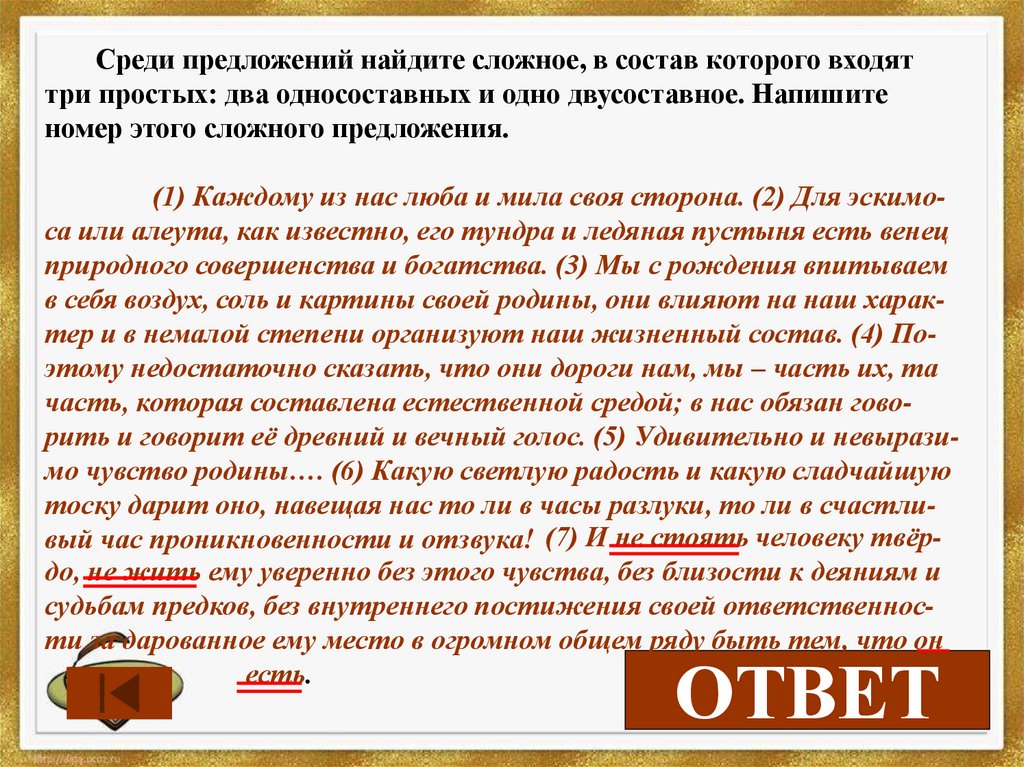 часть, которая составлена естественной средой; в нас обязан говорить и говорит её древний и вечный голос. (5) Удивительно и невыразимо чувство родины…. (6) Какую светлую радость и какую сладчайшую