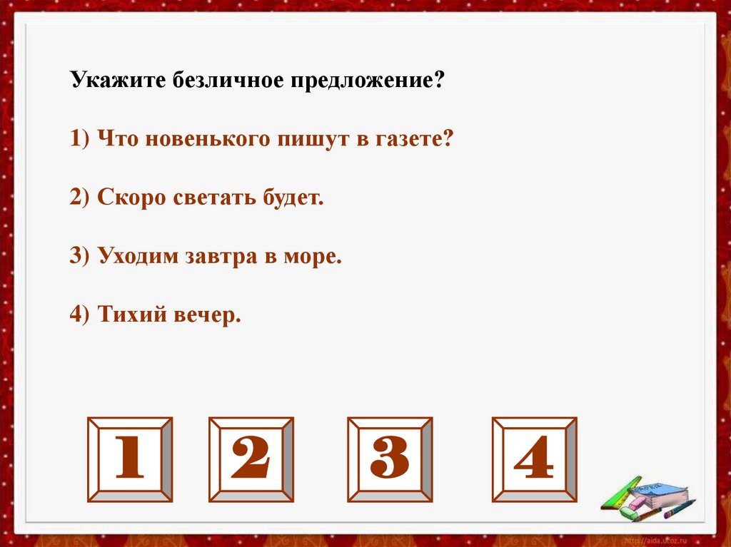 Укажите безличное предложение?1) Что новенького пишут в газете?