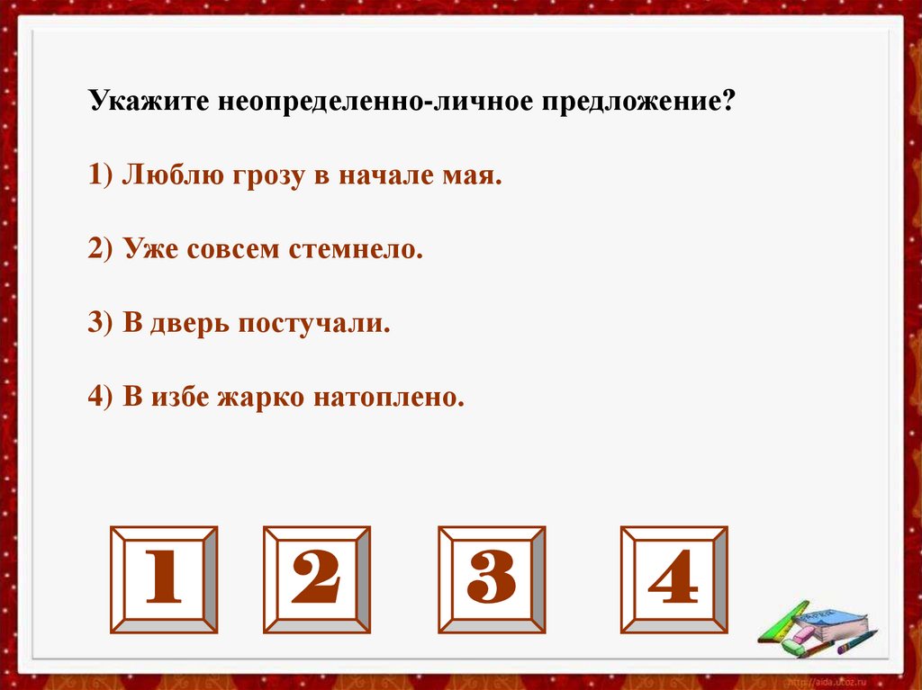 Укажите неопределенно-личное предложение?1) Люблю грозу в начале мая.