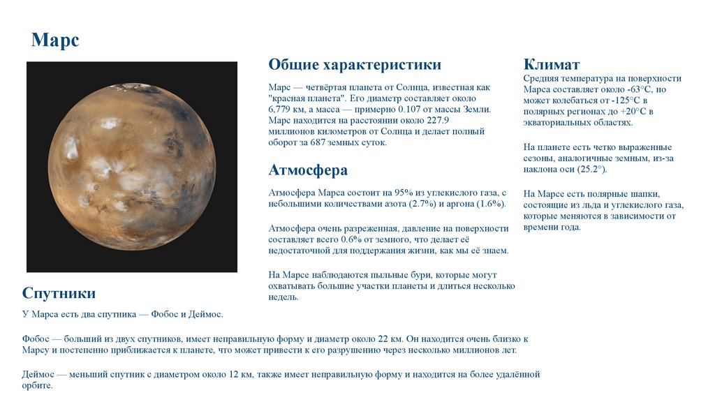 Фобос — больший из двух спутников, имеет неправильную форму и диаметр около 22 км. Он находится очень близко к