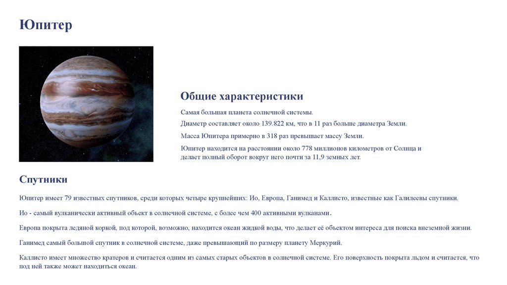 Юпитер имеет 79 известных спутников, среди которых четыре крупнейших: Ио, Европа, Ганимед и Каллисто, известные как Галилеевы спутники.