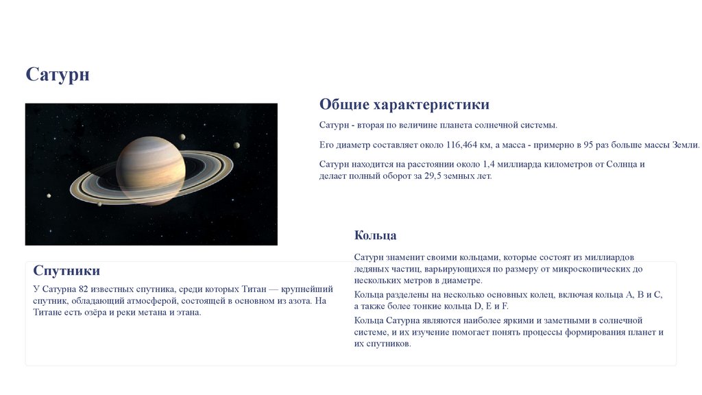 У Сатурна 82 известных спутника, среди которых Титан — крупнейший
