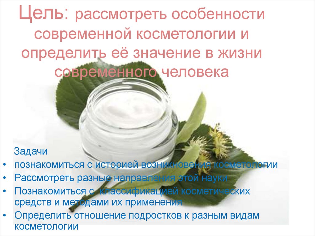 2. Цель: рассмотреть особенности современной косметологии и определить её значение в жизни современного человека