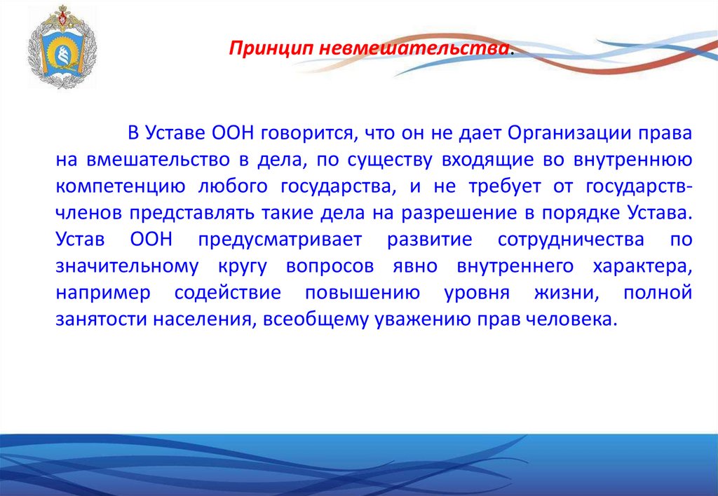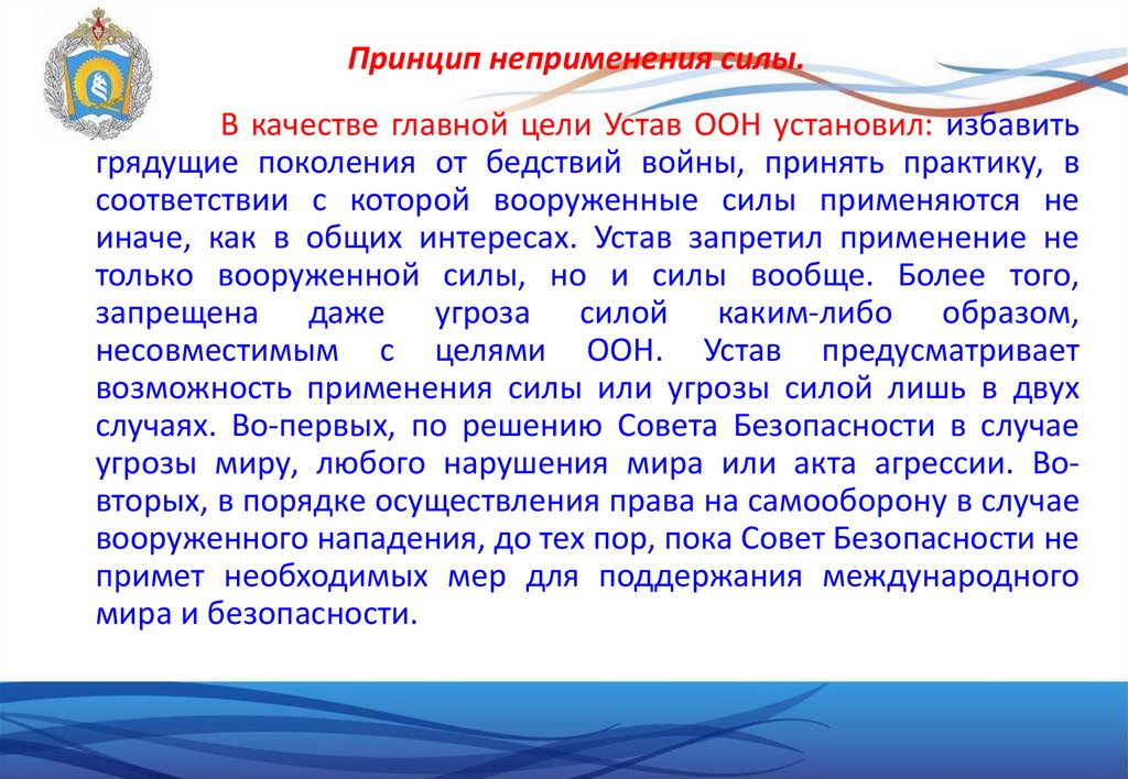 В качестве главной цели Устав ООН установил: избавитьгрядущие поколения от бедствий войны, принять практику, в