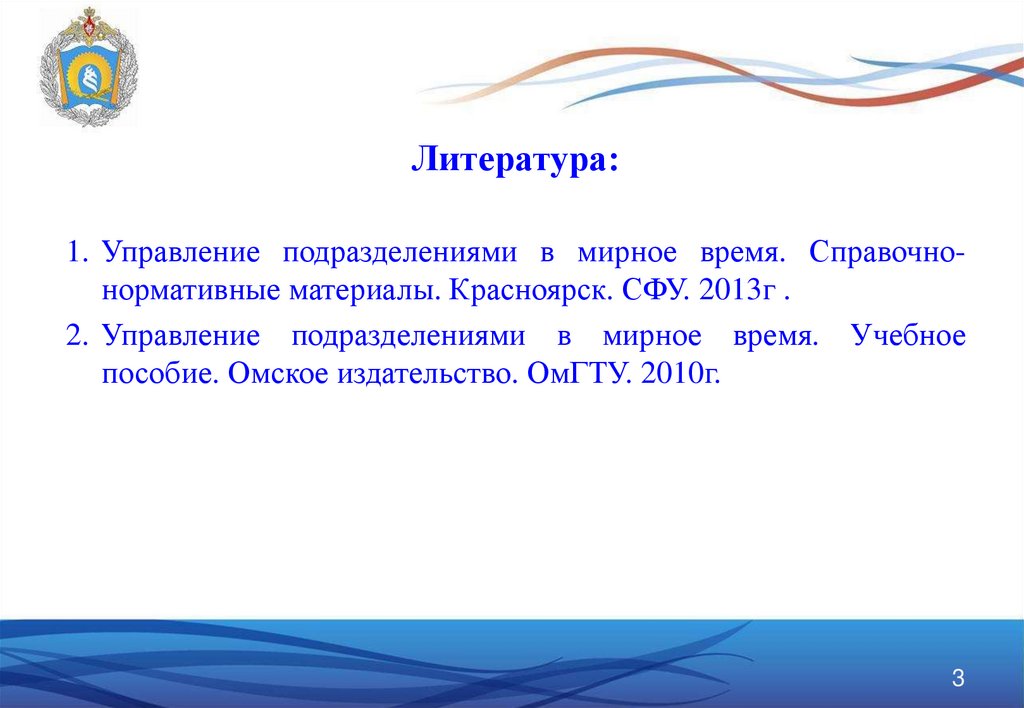 Литература:1. Управление подразделениями в мирное время. Справочнонормативные материалы. Красноярск. СФУ. 2013г .
